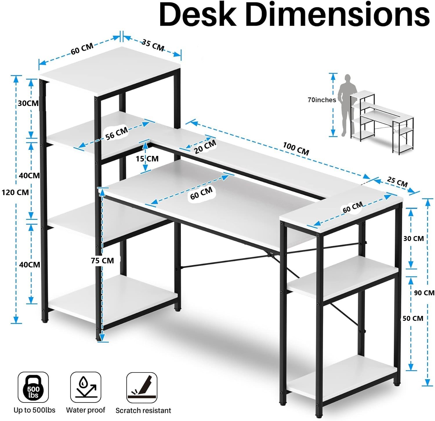 - 【هيكل متين】 مصنوع بإطار معدني وخشب أبيض متين، يدعم هذا المكتب ما يصل إلى 500 باوند. أقدام قابلة للتعديل وتصميم على شكل حرف X يعزز الثبات، بينما يضمن السطح المقاوم للماء والخدش سهولة التنظيف