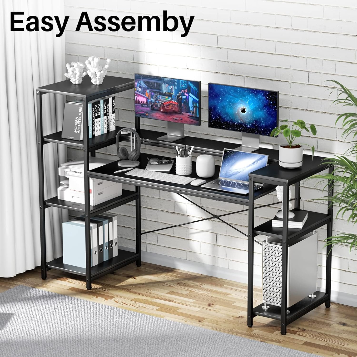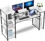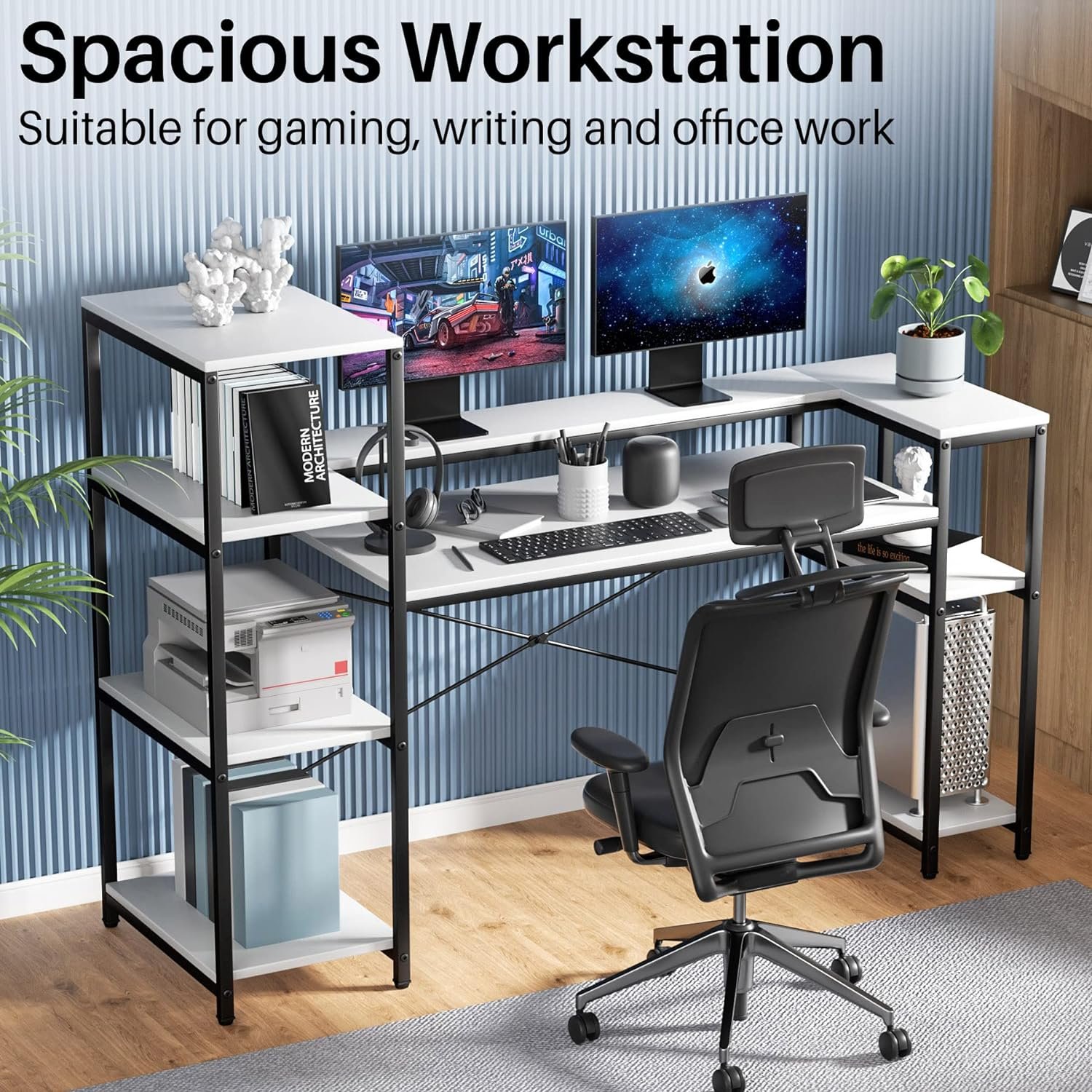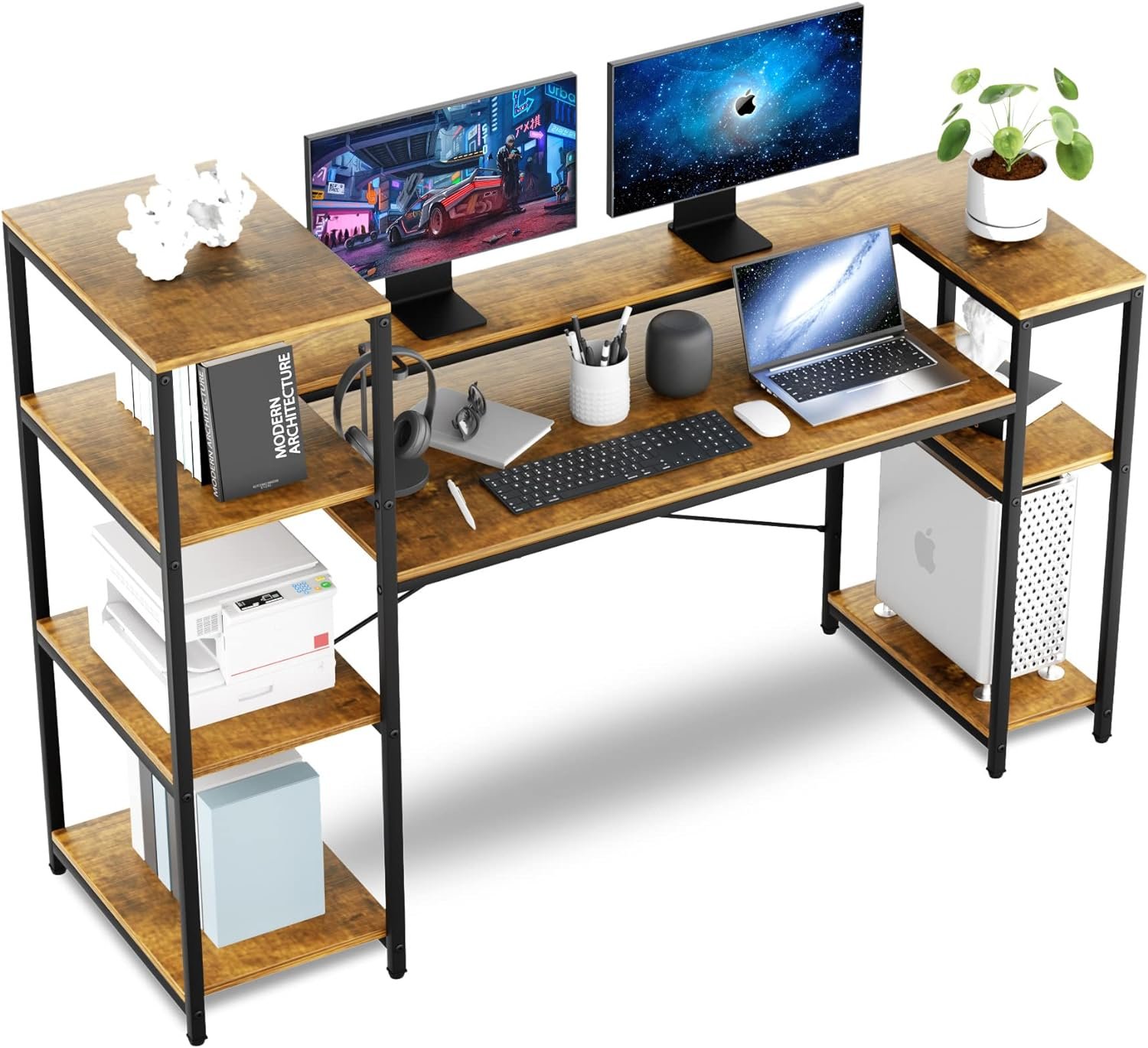 مكتب كمبيوتر مع ارفف تخزين من 4 طبقات، مكتب صناعي كبير 63 بوصة مع رف شاشة وحامل وحدة المعالجة المركزية، طاولة للعمل وللدراسة والكتابة مع حامل طابعة للمنزل والمكتب